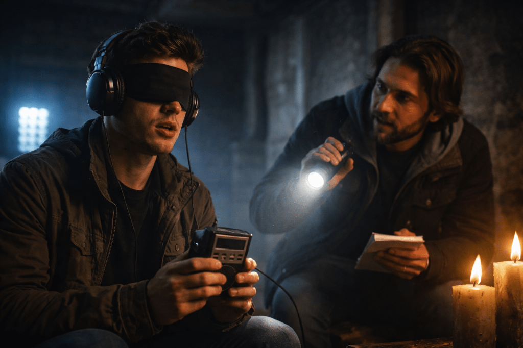 As I don’t have the time to delve too deeply here, let me provide a brief overview of the method. One person listens to a spirit box through headphones, often blindfolded, while another asks questions and listens for apparent responses. The individual listening is often described as being isolated from everyone else; placing focus on their responses based on what they are hearing from the spirit box. This is to provide the impression that they are not likely to be influenced by others present, meaning they have no idea what the questions are that are being asked out loud to the environment.