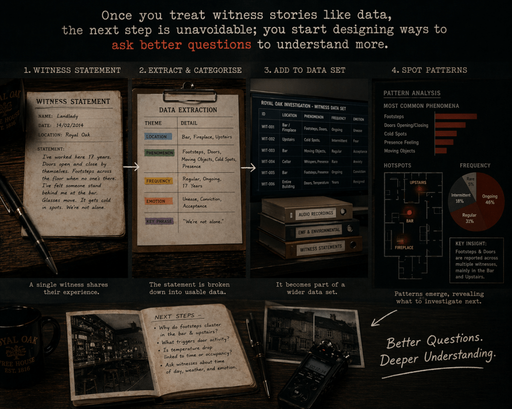 One thing that we already knew going into the Royal Oak case was the importance of witness statements as a source in a case such as this. They often provide you with a huge amount ofinformation to understand, but more importantly the more witness statements you collect the better as thats where experiences begin to cross over each other. The sightings of the same or similar apparitions, that curtain moving at the bottom of the stairs, pictures falling off the wall from time to time, footsteps being heard above the bar and many more. Whilst you often start with a single witness in paranormal cases on rare occasions these numbers can grow. During our time at the Royal Oak this is what happened, with the Landlady introducing us to more and more people that had an experience of some kind at the pub.