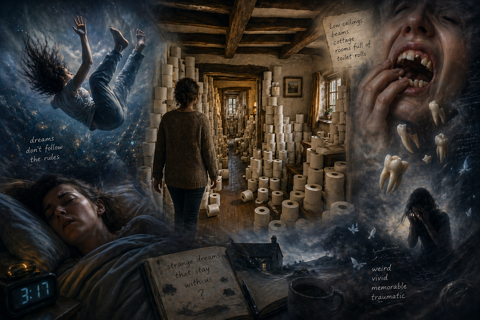 Personally I have had some really strange dreams over the years, which I partly attribute to being epileptic, but one that stands out more so than all others still baffles me to this day. Probably due to its vividness more so than anything else, but also because I remember it so clearly. In this dream I was walking around a cottage, which I knew because of low ceilings which had beams. However, each room I entered I would find toilet rolls stacked floor to ceiling, single rolls too. It was weird and clearly memorable. Final part of the dream before I woke up had something to do with my teeth, which is the least clear part. I cannot clearly remember if my teeth were wobbly, falling out, or both. Either way it felt traumatic and I woke up. And you hear many people share odd stories such as these throughout the paranormal.