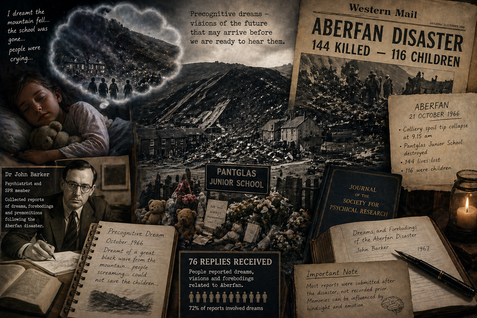 A psychiatrist most associated with the case, John Barker, would later write reports in the Journal of the Society for Psychical Research on dreams, forebodings, and related experiences that indicated a certain amount of precognitive understanding of the events that occurred in Aberfan. Barker’s interest in the events at Aberfan had triggered him to appeal for people to submit their experiences of dreams of these events and he had received 76 replies. The only downside about Barker’s work was that they were retrospectively reported testimony and not dreams recorded prior to the event itself. This matters from a psychical research point of view because whilst the reports were compelling due to their emotional force, they were captured after the event occurred and its impact had been felt nationally, meaning it could have influenced the memory recall of these dreams. Still its an interesting case worth looking into if you want to understand a little more about dreams of future events.